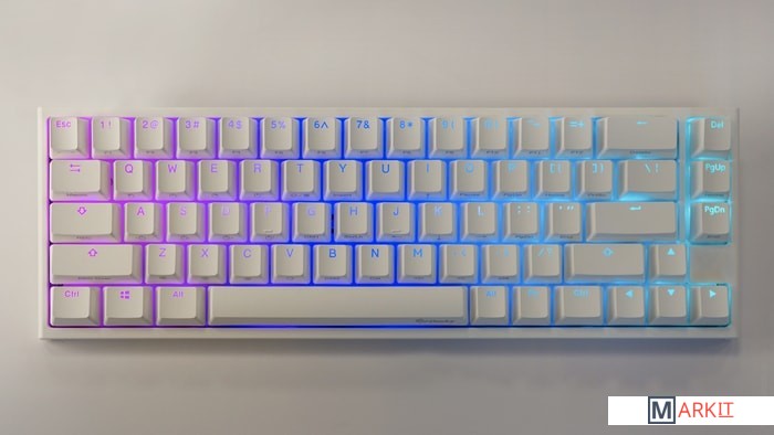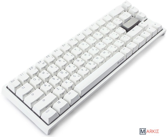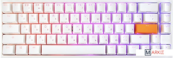 RGB подсветкаПрисутствует множество различных режимов, регулировка цвета осуществляется через палитру или отдельную настройку красного, зеленого, синего цветов. Также можно создать кастомный режим статичной подсветки.ПрограммируемаяDucky Macro 2.0 дает возможность создавать макросы. Можно создать свои мультимедиа, функциональные макросы и многое другое.Регулируемые ножкиДвойные регулируемые ножки предоставляют целых два угла наклона клавиатуры для более комфортной печати, а их прорезиненный низ не даст клавиатуре сдвинуться с местаРусифицированные PBT double-shot клавишиИзготовлены из высокопрочного пластика PBT с применением double-shot технологии, что гарантирует их долговечность и надежность в эксплуатации.DIP-переключателиДают возможность поменять расположение клавиши FN и переключиться между NKRO и 6KRO.Функция Full N-key Rollover по USB (NKRO)Позволяет нажимать одновременно неограниченное количество клавиш. Для печати идеально подойдет как 6KRO, так и NKRO независимо от вашей скорости. Для игр NKRO будет плюсом и неважно, нажимаете ли вы больше 6 кнопок или нет, поскольку, играя в любую игру, вы можете случайно нажать пару лишних клавиш и из-за этого клавиатура имеет шанс не среагировать на нажатие, которые вы хотели совершить изначально. Также присутствует возможность переключения на 6KRO.